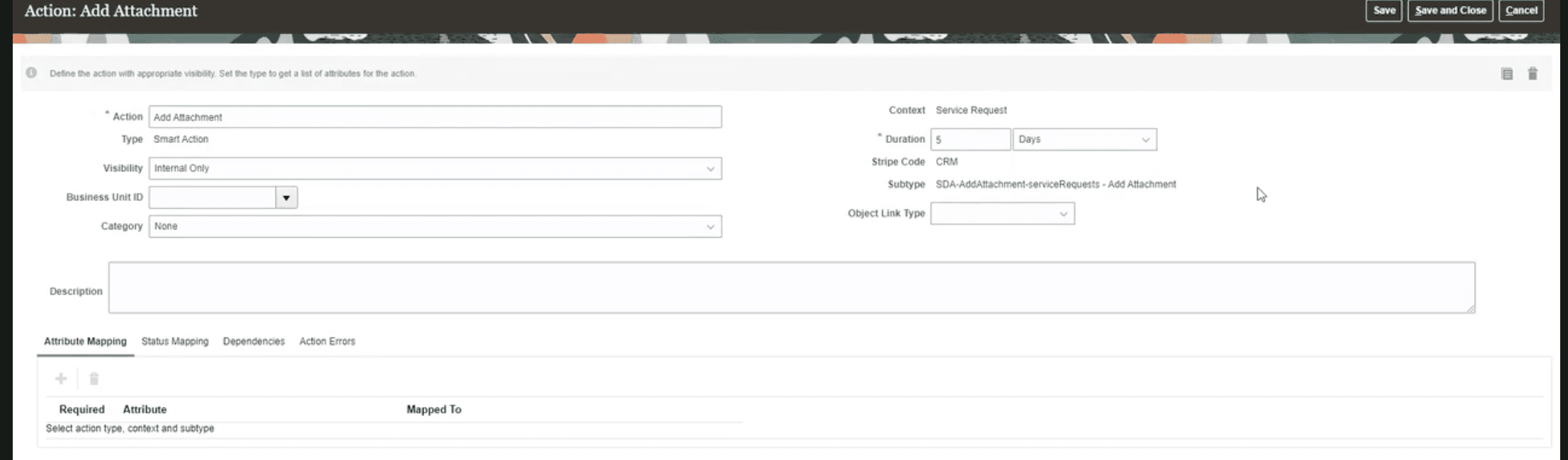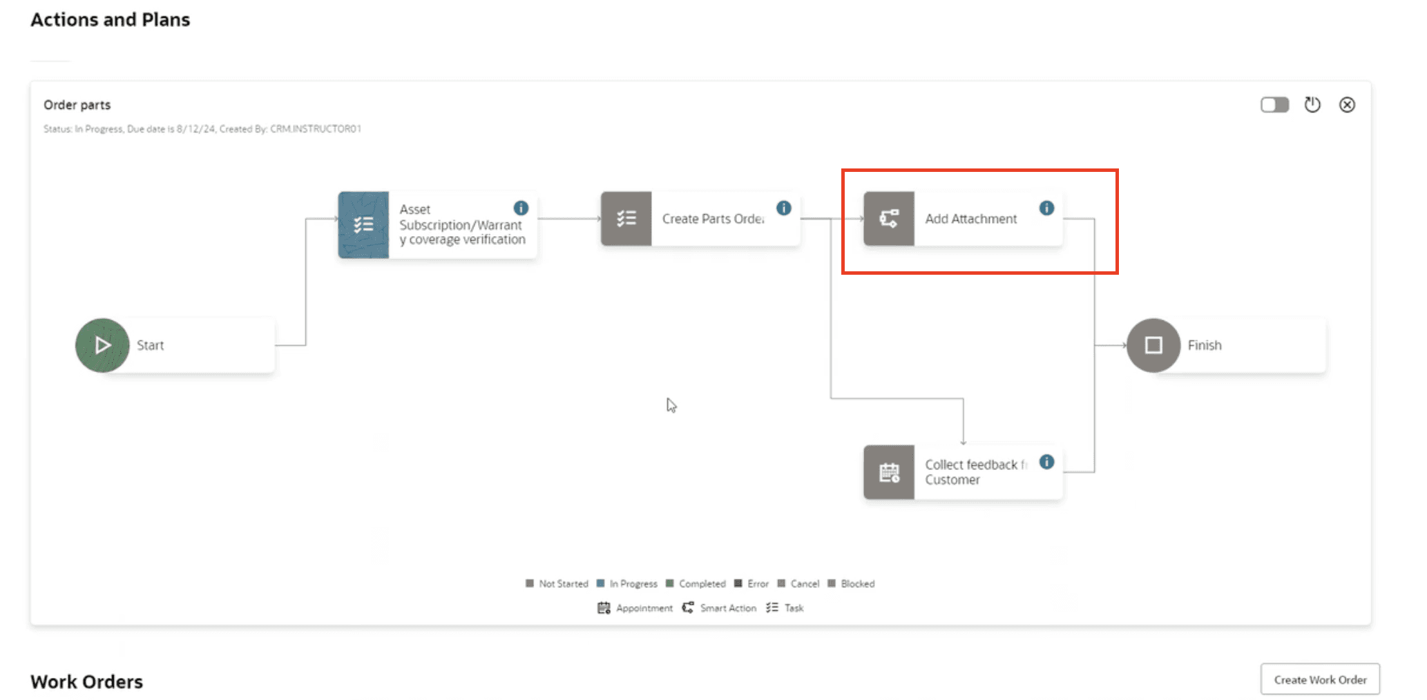 There are no required actions to enable this feature. An admin would just need to add the smart action to an action plan in setup and maintenance. I would like to note that custom smart actions can also be made but would need to be completed in app composer instead of setup and maintenance. Below is an example of smart action being a created.