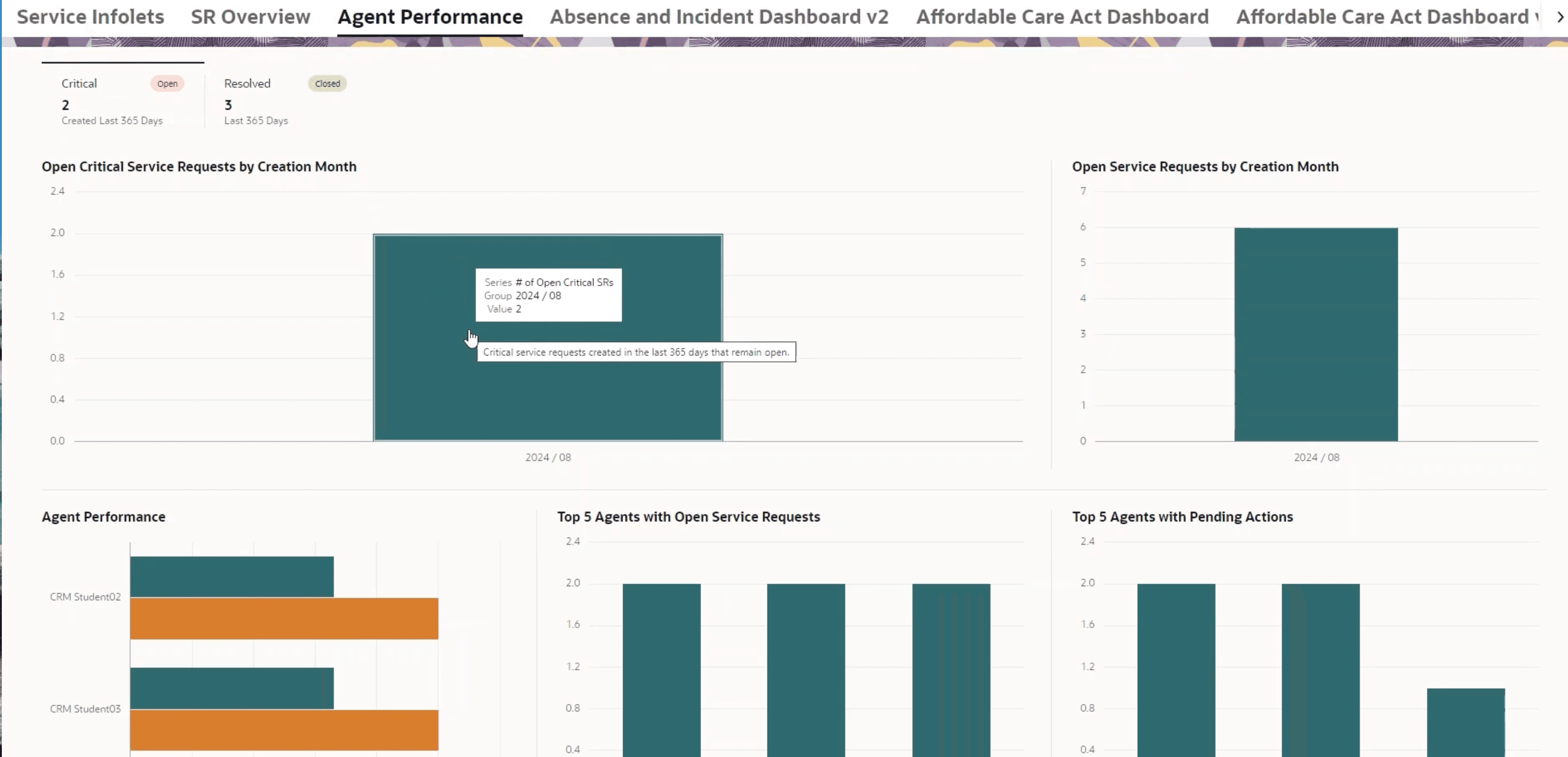 Agent Performance has a similar look but is tailored for managers with metrics around agent performance like top 5 agents with open service request, Agent performance and Top 5 Agents with pending actions. Similar to the SR Overview dashboard managers can filter on critical and resolved SRs.