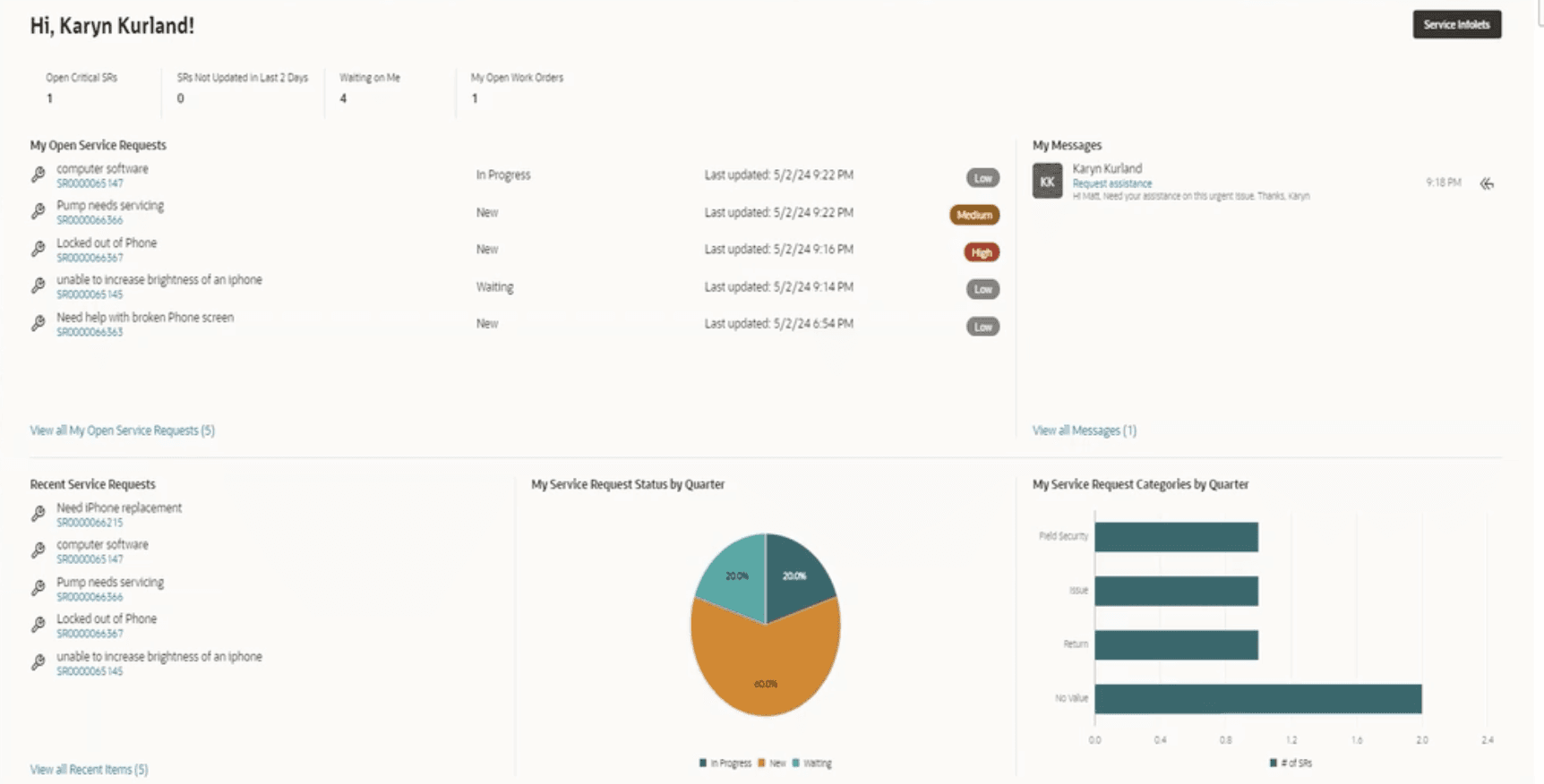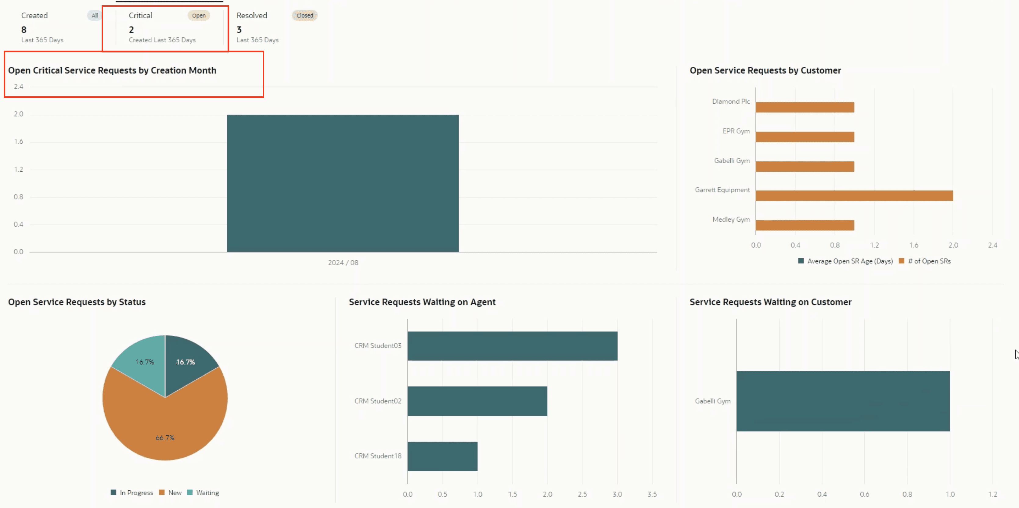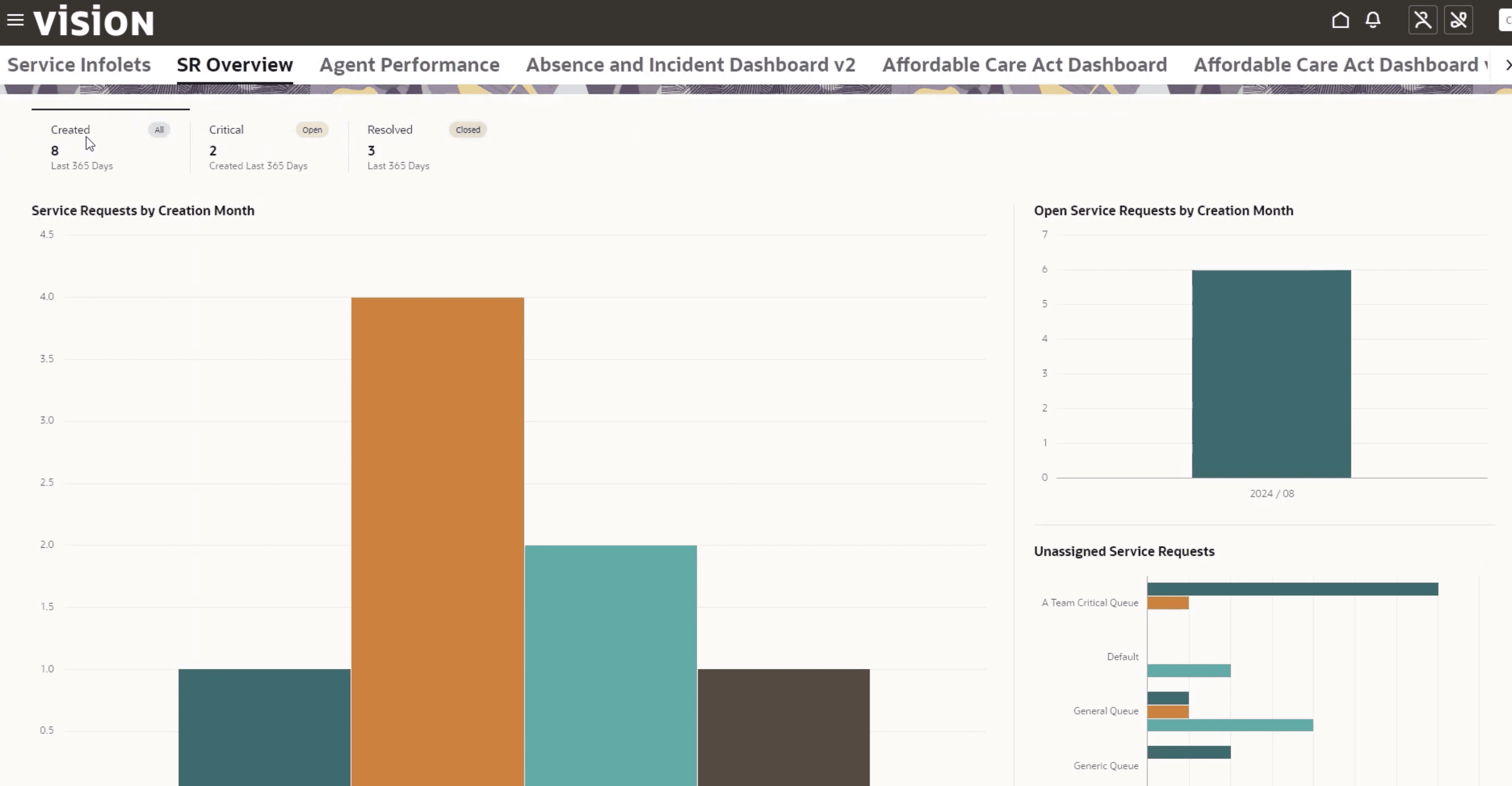 Service Overview: It helps identify patterns and trends for Service requests. It displays to users with the service representative view privilege