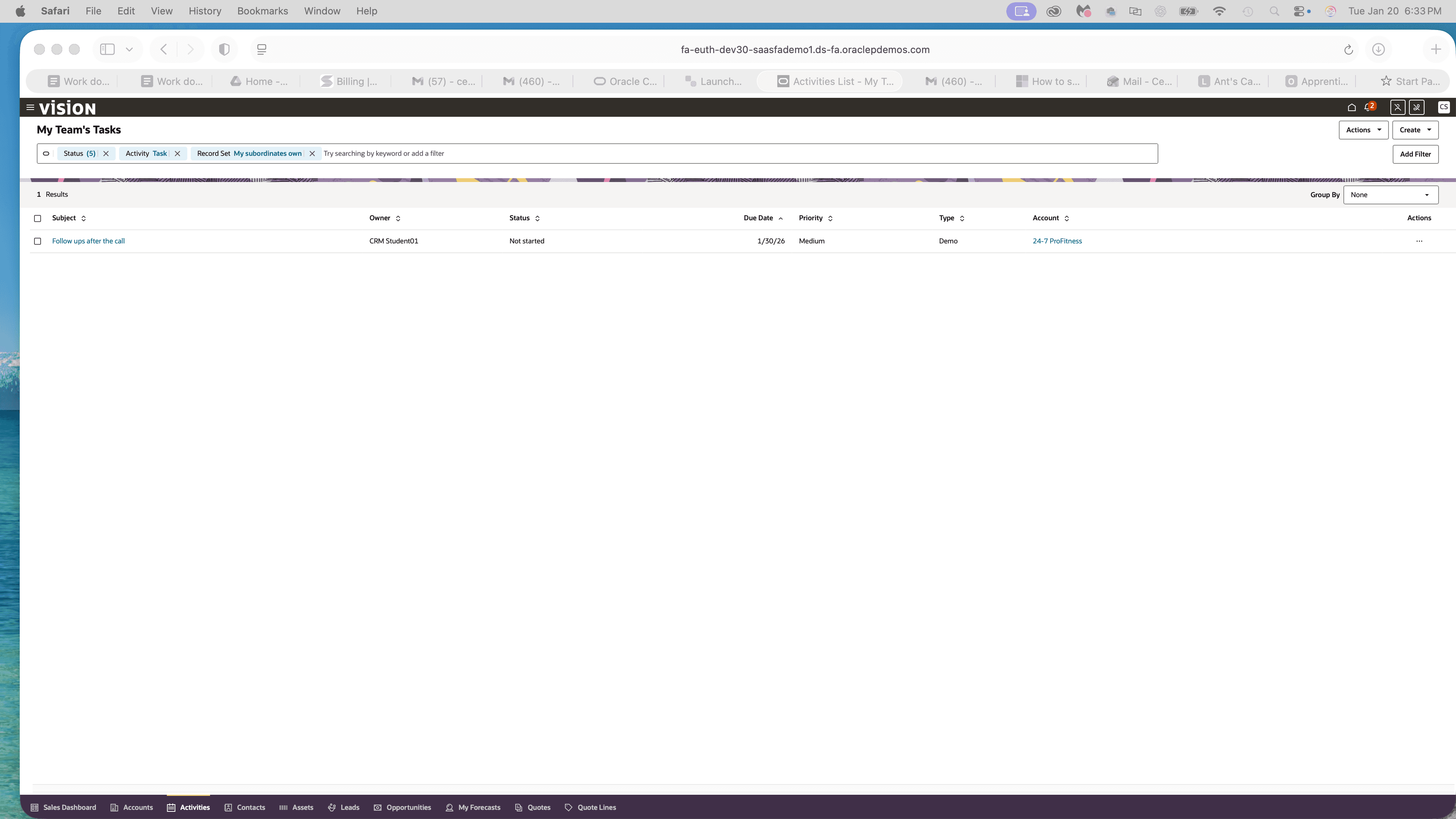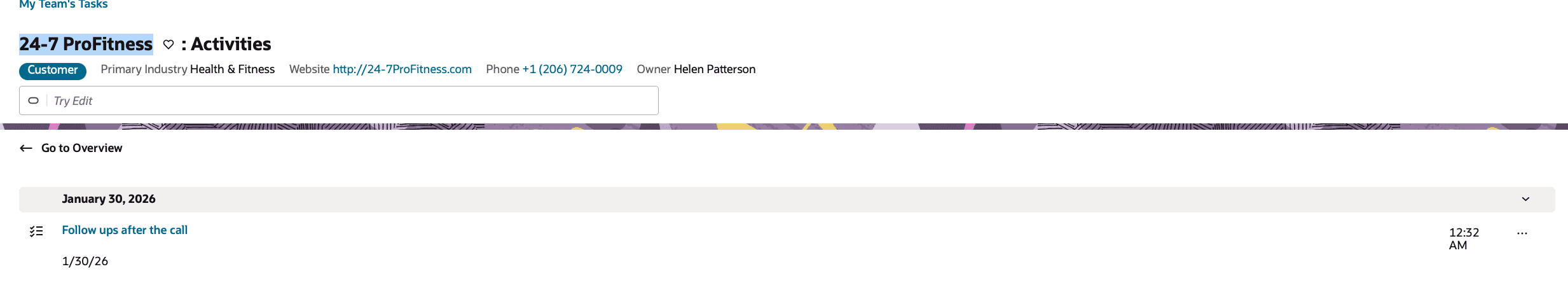 I created a task using the create page and associated it with an account named 24-7 ProFitness. The task creation experience is similar to creating an appointment, allowing consistent navigation and data entry across activity types. After saving the task, I navigated to the Activities tab to review the task within the related activities list.