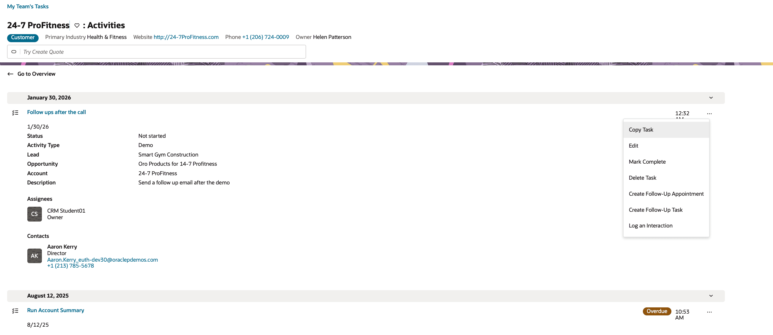 The task was visible within the Activities section and could be managed directly from the list. From this view, the task could be edited, marked as complete, copied, or deleted. This provides sellers with flexibility to manage their work without navigating away from the related record.